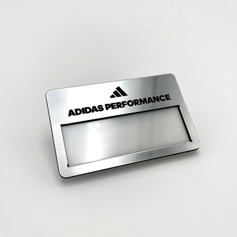 Gafete reutilizable de aluminio con grabado láser, ventana de acetato y respaldo de acrílico con broche magnético.